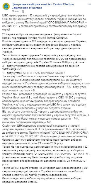 В четверг, 20 июня, состоялось очередное заседание Центральной избирательной комиссии, в ходе которого были зарегистрированы 132 кандидата в народные депутаты Украины в одномандатных избирательных округах на внеочередных парламентских выборах. В числе зарегистрированных 127 баллотирующихся в порядке самовыдвижения и 5 выдвинутых политическими партиями.