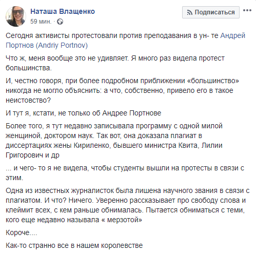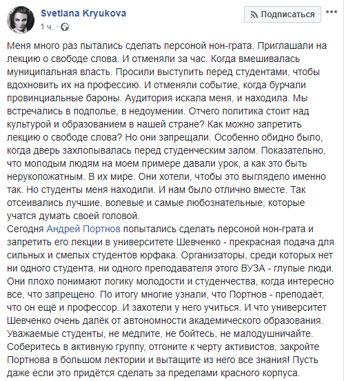 Сегодня Андрей Портнов попытались сделать персоной нон-грата и запретить его лекции в университете Шевченко - прекрасная подача для сильных и смелых студентов юрфака. Организаторы, среди которых нет ни одного студента, ни одного преподавателя этого ВУЗА - глупые люди. Они плохо понимают логику молодости и студенчества, когда интересно все, что запрещено. По итогу многие узнали, что Портнов - преподаёт, что он ещё и профессор. И захотели у него учиться. И что университет Шевченко очень далёк от автономности академического образования.