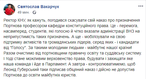 "Ректор КНУ, как говорят, согласился отменить свой приказ о назначении Портнова профессором кафедры конституционного права. Это - победа, прежде всего, студентов, которые громко и четко указали администрации ВУЗОВ на недопустимость таких назначений. А еще - мобилизовали в свою поддержку активистов и гражданских лидеров, среди которых и кандидаты от "Голоса". За такими молодыми людьми - будущее нашей страны!