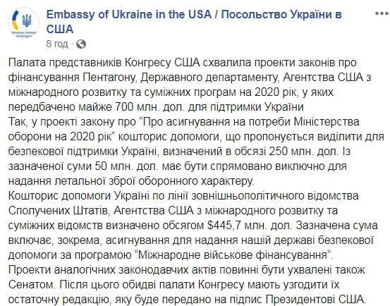 "Палата представителей Конгресса США одобрила проекты законов о финансировании Пентагона, Государственного департамента, Агентства США по международному развитию (USAID) и смежных программ на 2020 год, в которых предусмотрено почти 700 млн. долларов для поддержки Украины.
