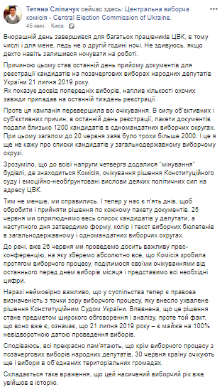 "Как показывает опыт предыдущих выборов, наплыв количества желающих всегда приходился на последнюю неделю регистрации. Однако эта кампания превзошла все ожидания. В силу объективных и субъективных причин, в последний день регистрации пакеты документов подали около 1200 кандидатов в одномандатных избирательных округах. При этом в целом до 20 июня заявлений было чуть больше 2000. И это я еще не говорю о списках кандидатов в общегосударственном избирательном округе", - написала Слипачук.