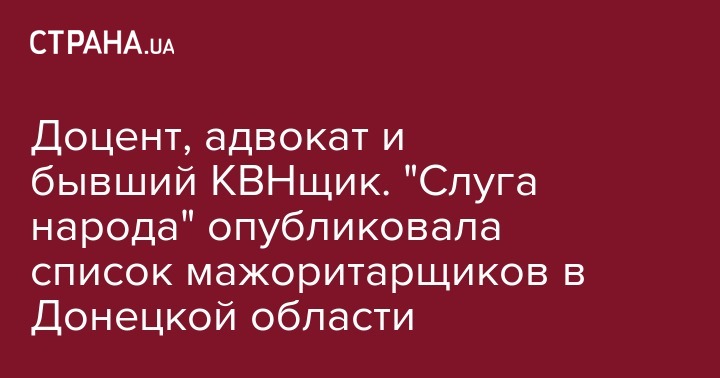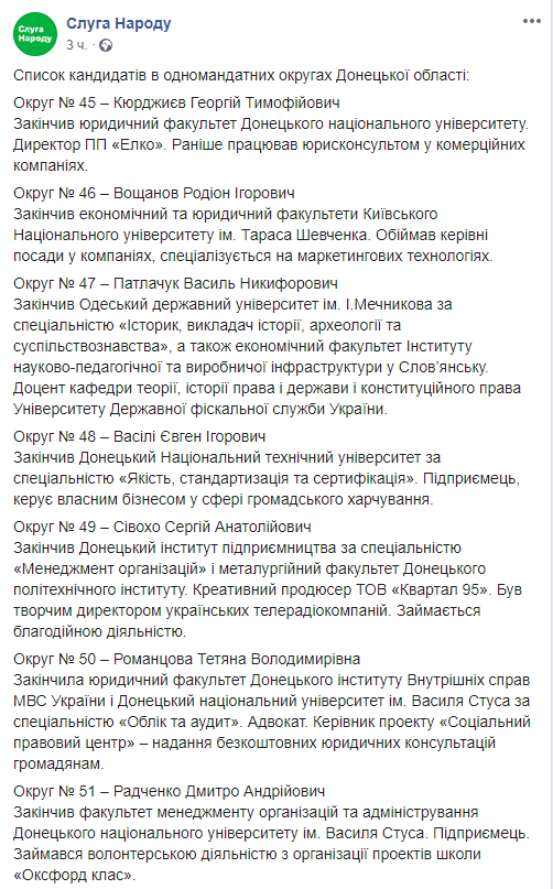В пятницу, 21 июня, партия "Слуга народа" опубликовала информацию о кандидатах на досрочные выборы в Верховную рады в одномандатных округах Донецкой области. Список обнародован на странице партии в Facebook.