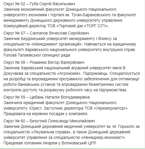 В округе 58 (Центральный район Мариуполя) – предприниматель, занимающийся разработкой и внедрением программного обеспечения для оптимизации работы банковских учреждений, внедрения систем контроля доступа и расчета рабочего времени на предприятиях Виктор Романюк.