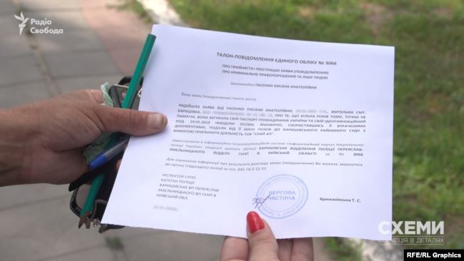 По данным редакции "Схем", полиция приняла обращение женщины, хоть и не имела документов. Оно зарегистрировано в Барышевском отделении полиции Переяслав-Хмельницкого отдела ГУНП в Киевской области.
