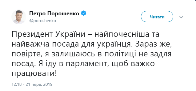 "Президент Украины - почетная и трудная должность для украинца. Сейчас же, поверьте, я остаюсь в политике не ради должностей. Я иду в парламент, чтобы тяжело работать!", - заявил Порошенко.