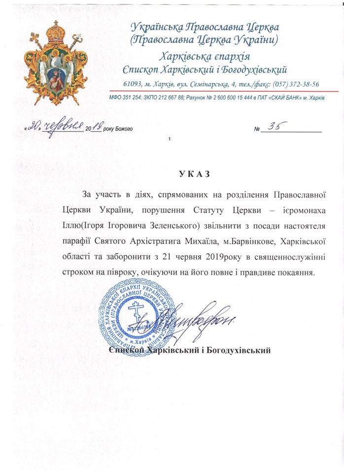В свою очередь, иеромонах Илья (Игорь Зеленский) указом епископа Харьковского и Богодуховского освобожден от должности настоятеля прихода Святого Архистратига Михаила в г. Барвенково Харьковской области и отстранен от священнослужения сроком на полгода "за участие в действиях, направленных на разделение ПЦУ, нарушение устава Церкви".