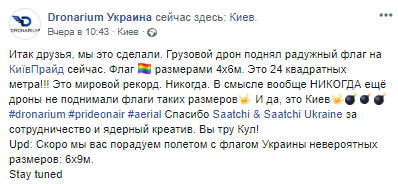 "Итак друзья, мы это сделали. Грузовой дрон поднял радужный флаг на КиевПрайд сейчас. Флаг размерами 4х6м. Это 24 квадратных метра!!! Это мировой рекорд. Никогда. В смысле вообще НИКОГДА ещё дроны не поднимали флаги таких размеров. И да, это Киев!" - говорится в сообщении.