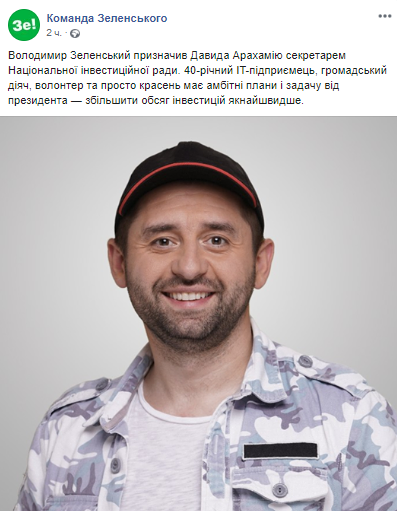 Президент Владимир Зеленский назначил блогера, IT-предпринимателя и являющегося четвертым номером партии "Слуга народа" Давида Арахамию секретарем Национального инвестиционного совета. Об этом говорится в указе № 423/2019, опубликованном на сайте главы государства. Также о назначении сообщается на странице Команды зеленского в соцсети.