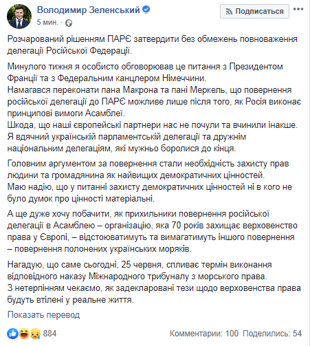 "На прошлой неделе я лично обсуждал этот вопрос с Президентом Франции и с Федеральным канцлером Германии. Пытался убедить господина Макрона и госпожу Меркель, что возвращение российской делегации в ПАСЕ возможно лишь после того, как Россия выполнит принципиальные требования Ассамблеи. Жаль, что наши европейские партнеры нас не услышали и поступили иначе", - написал Владимир Зеленскрий.