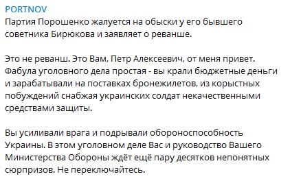 "Партия Порошенко жалуется на обыски у его бывшего советника Бирюкова и заявляет о реванше. Это не реванш. Это Вам, Петр Алексеевич, от меня привет. Фабула уголовного дела простая - вы крали бюджетные деньги и зарабатывали на поставках бронежилетов, из корыстных побуждений снабжая украинских солдат некачественными средствами защиты", - написал Портнов.