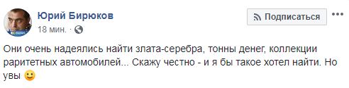 Кстати, и сам экс-советник подтвердил обыски. "Они очень надеялись найти злата-серебра, тонны денег, коллекции раритетных автомобилей... Скажу честно - и я бы такое хотел найти. Но увы", - написал он в Facebook.