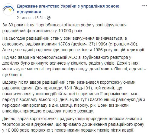 За 33 года после Чернобыльской катастрофы в зоне отчуждения радиационный фон снизился в 10 000 раз, но эта территория непригодна для проживания людей. Об этом в Facebook сообщает Госагентство Украины по управлению зоной отчуждения.