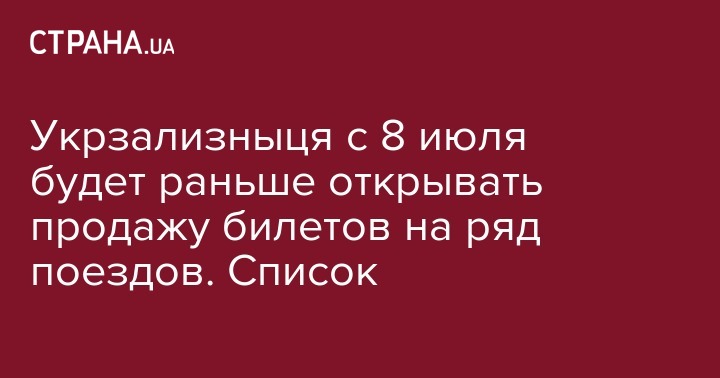 С 8 июля "Укрзализныця" будет раньше открыть продажу билетов на ряд поездов. Об этом сообщает пресс-служба компании