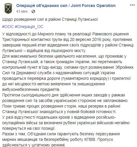 Как отмечается, пока идет процесс разведения сторон, резерв украинских войск в районе Станицы Луганской находятся в полной боевой готовности. "В случае отсутствия дальнейших шагов по отводу российско-оккупационных войск за определенные рубежи украинские военные немедленно вернутся на свои позиции", - подчеркивают в ООС. "Для максимальной безопасности гражданского населения, проживающего в Станице Луганской, а также граждан Украины, которые пересекают контрольный пункт въезда-выезда (КПВВ), силами групп разминирования Вооруженных сил и Государственной службы по чрезвычайным ситуациям Украины проводится проверка дороги (гуманитарного коридора) и прилегающей к ней местности с целью выявления и обезвреживания взрывоопасных предметов", - сказано в сообщении.