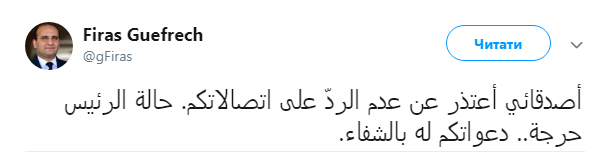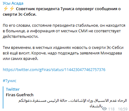 Ранее советник президента Туниса опубликовал сообщение в котором говорилось, что "ситуация является критической" и также попросил молитв.