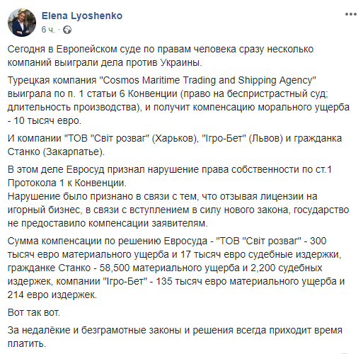 "Компании "ТОВ "Свит розваг" (Харьков), "Игро-Бет" (Львов) и гражданка Станко (Закарпатье). В этом деле Евросуд признал нарушение права собственности по ст.1 Протокола 1 к Конвенции. Нарушение было признано в связи с тем, что отзывая лицензии на игорный бизнес, в связи с вступлением в силу нового закона, государство не предоставило компенсации заявителям. Сумма компенсации по решению Евросуда - "ТОВ "Свит розваг" - EUR300 тыс. материального ущерба и EUR17 тыс. судебные издержки, гражданке Станко - EUR58,5 тыс. материального ущерба и EUR2,2 тыс. судебных издержек, компании "Игро-Бет" - EUR135 тыс. материального ущерба и EUR214 издержек",- написала она.