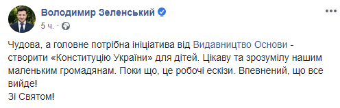 "Замечательная, а главное нужна инициатива от издательства "Основы" - создать "Конституцию Украины" для детей. Интересную и понятную нашим маленьким гражданам. Пока, это рабочие эскизы. Уверен, что все получится! С Праздником!" - говорится в сообщении.