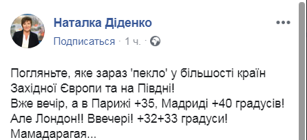 Вечером 29 июня погода не принесла европейцам облегчения. На юго-западе Европы температура достигает +40 градусов Цельсия. Об этом пишет на своей странице в Facebook синоптик Наталья Диденко.