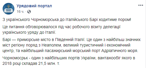 "Из украинского Черноморска в итальянский Бари будет ходить паром! Этот вопрос обсуждался во время рабочего визита делегации украинского правительства в Италии", - говорится в сообщении.