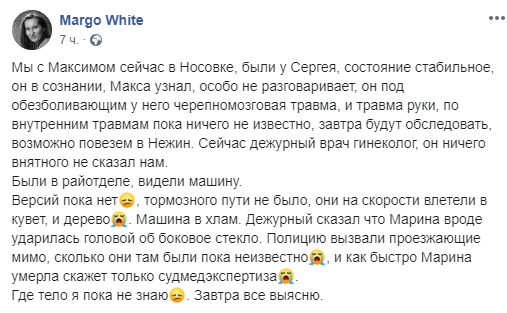 "Версий пока нет, тормозного пути не было, они на скорости влетели в кювет, и дерево. Машина в хлам. Дежурный сказал что Марина вроде ударилась головой о боковое стекло. Полицию вызвали проезжающие мимо, сколько они там были пока неизвестно, и как быстро Марина умерла скажет только судмедэкспертиза. Где тело я пока не знаю. Завтра все выясню", - сообщила автор поста.