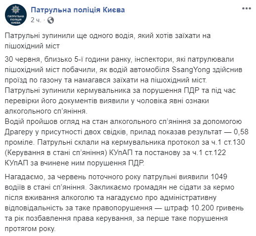 В Киеве 30 июня патрульные полицейские остановили еще одного водителя, который хотел заехать на пешеходный мост на автомобиле SsangYong. Инцидент произошел около 5 часов утра, водитель успел проехать по газону и пытался заехать на пешеходный мост.