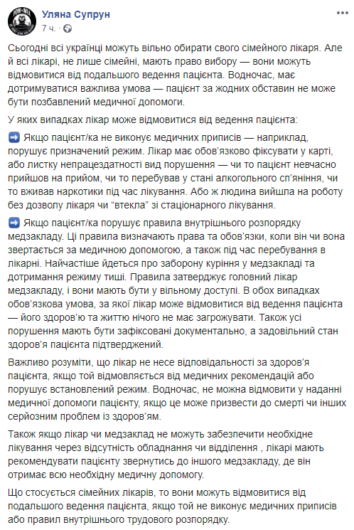Исполняющая обязанности министра здравоохранения Ульяна Супрун поделилась с украинцами информацией о том, при каких обстоятельствах семейный врач может разорвать договор с пациентом.