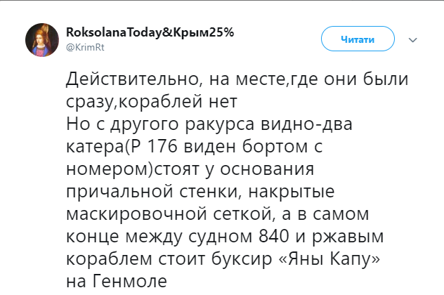 "Действительно, на месте, где они были сразу, кораблей нет. Но с другого ракурса видно - два катера (Р176 виден бортом с номером) стоят у основания причальной стенки, накрытые маскировочной сеткой, а в самом конце между судном 840 и ржавым кораблем стоит буксир "Яны Капу" на Генмоле", - говорится в сообщении.