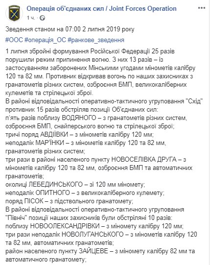 В понедельник, 1 июля, в зоне ООС противник 25 раз нарушил режим прекращения огня, в результате погибли двое украинских военных. Об этом сообщает пресс-центр Штаба ООС на странице в Facebook.