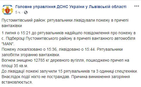 Было установлено, что уголь перевозился в фуре марки MAN. Сам грузовик не пострадал. Однако грузовой прицеп сгорел почти полностью. Также огонь уничтожил 13 тонн древесного угля. Ликвидацией возгорания в селе Подберезцы занимались 15 пожарных, а также 3 специальных автомобиля.