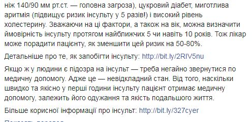 По ее данным, уже много лет инсульт на втором месте среди причин инвалидности и смертности как в мире, так и в Украине. Супрун также пишет, что с 2020 года в Украине начнут создавать современные инсультные центры по евростандартам, если осенью все учреждения специализированной помощи подпишут договор с Национальной службой здоровья.