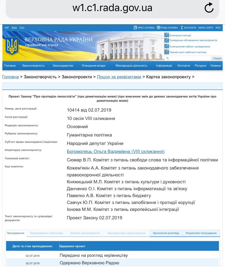 Автором законопроекта выступила народный депутат Ольга Богомолец. Главным комитетом значится комитет по вопросам свободы слова и информационной политики Виктории Сюмар.