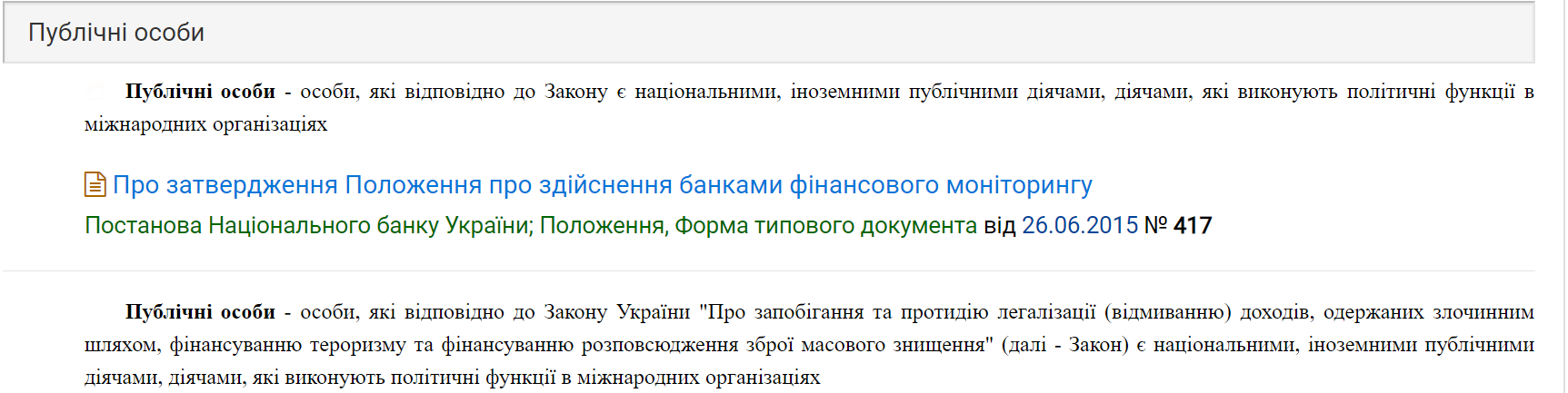 На сайте Верховной Рады публичные люди обозначаются так: "Публичные лица - лица, которые согласно Закону Украины "О предотвращении и противодействии легализации (отмыванию) доходов, полученных преступным путем, финансированию терроризма и финансированию распространения оружия массового уничтожения" являются национальными, иностранными публичными деятелями, деятелями, которые выполняют политические функции в международных организациях".
