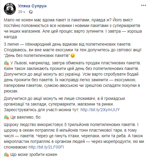 Ульяна Супрун призвала украинцев хотя бы один день прожить без пластиковых пакетов и приобрести экосумки. И.о. главы Минздрава напомнила, что 3 июля - Международный день отказа от полиэтиленовых пакетов.
