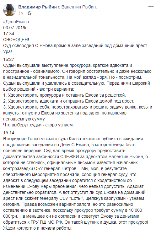 "Суд освободил С.Ежова прямо в зале заседаний под домашний арест", - сообщается на странице адвоката.