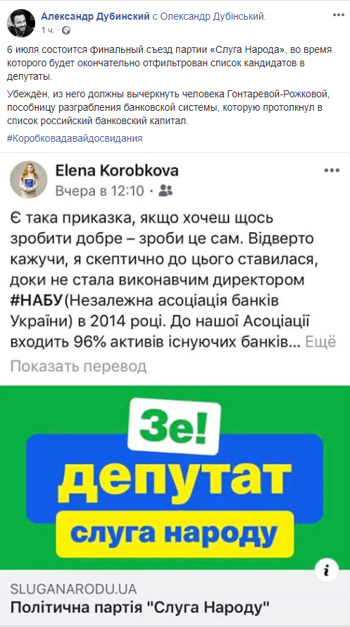 "6 июля состоится финальный съезд партии "Слуга Народа", во время которого будет окончательно отфильтрован список кандидатов в депутаты. Убеждён, из него должны вычеркнуть человека Гонтаревой-Рожковой, пособницу разграбления банковской системы, которую протолкнул в список российский банковский капитал", - написал он.