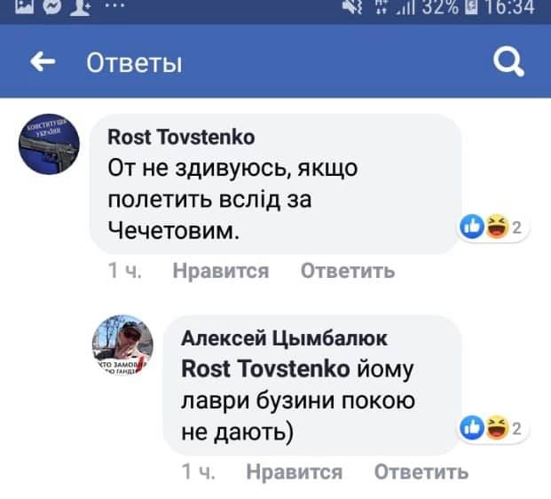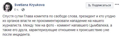 "Глава комитета по свободе слова, президент и кто угодно из органов власти не прокомментировали нападение на нашего журналиста. Между тем на фото - коммент напавшего Цымбалюка, а также его друга, характеризующие отношение к происшествию уже после инцидента", -сообщила она и приобщила комментарий Цымбалюка.