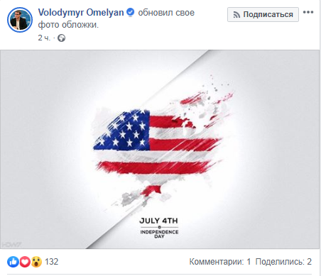 Министр инфраструктуры Украины Владимир Омелян в четверг, 4 июля, выложил в Facebook новую обложку профиля, посвященную Дню независимости США.