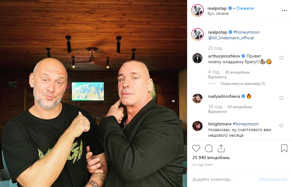 В социальной сети появилось совместное фото украинского певца и продюссера Потапа и известного рок-музыканта  и вероятного отца младшей дочери певицы Светланы Лободы, вокалиста Rammstein Тилля Линдеманна. Снимок опубликован на странице Потапа в Instagram.