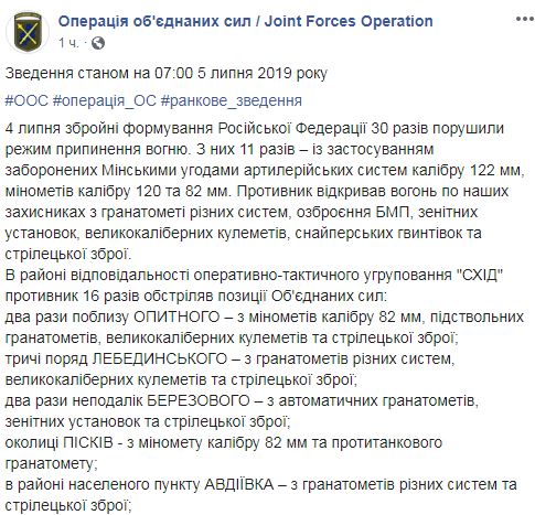 Отмечается, что противник 30 раз нарушил режим прекращения огня, из них 11 раз - с применением запрещенных Минскими соглашениями артиллерийских систем калибра 122 мм, минометов калибра 120 и 82 мм. "Противник открывал огонь по нашим защитникам из гранатомета различных систем, вооружения БМП, зенитных установок, крупнокалиберных пулеметов, снайперских винтовок и стрелкового оружия", - отмечается в сводке по состоянию на 07:00 5 июля.
