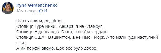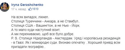Это не прошло незамеченным. Вице-спикер Верховной Рады Ирина Геращенко отреагировала "ликбезом" на своей странице в Facebook, перечислив некоторые столицы других стран. При этом и в ее пост закралась ошибка.
