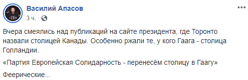 "Вчера смеялись над публикаций на сайте президента, где Торонто назвали столицей Канады. Особенно ржали те, у кого Гаага - столица Голландии.
