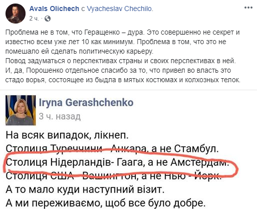 Сперва Зеленский посетил Торонто в качестве столицы Канады, а потом Геращенко решила его поправить и поучить географии... указав, что столица Нидерландов ... Гаага :)