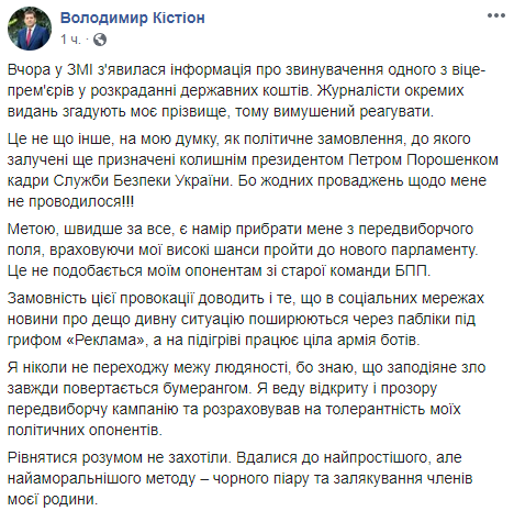 "Вчера в СМИ появилась информация об обвинении одного из вице-премьеров в хищении государственных средств. Журналисты отдельных изданий вспоминают мою фамилию, поэтому вынужден реагировать. Это не что иное, как мне кажется, как политический заказ, в который вовлечены еще назначенные бывшим президентом Петром Порошенко кадры Службы безопасности Украины. Потому что никаких производств в отношении меня не проводилось !!!", - написал Кистион.