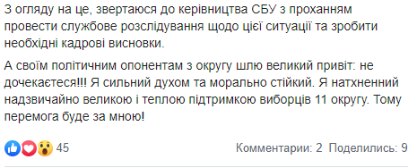 "Я веду открытую и прозрачную предвыборную кампанию и рассчитывал на толерантность моих политических оппонентов", -заявил Кистион, подчеркнув, что его оппоненты "прибегли к самому простому, но самому аморальному методу – черному пиару и запугиванию членов моей семьи". "Учитывая это, обращаюсь к руководству СБУ с просьбой провести служебное расследование по этой ситуации и сделать необходимые кадровые выводы", - заявил Кистион.