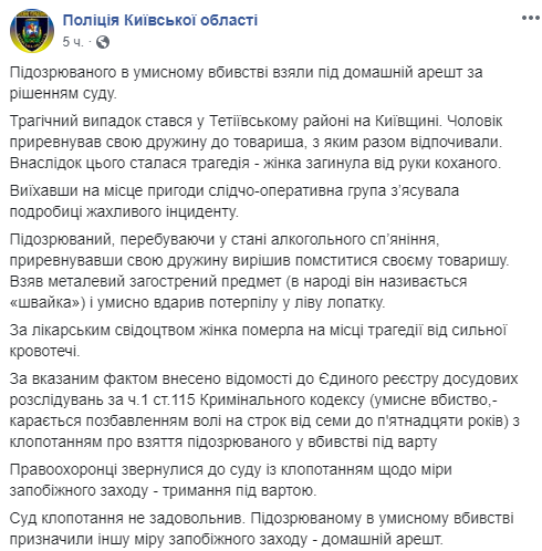 В Киевской области мужчина из-за ревности убил свою жену. Об этом в Facebook сообщает пресс-служба Нацполиции.