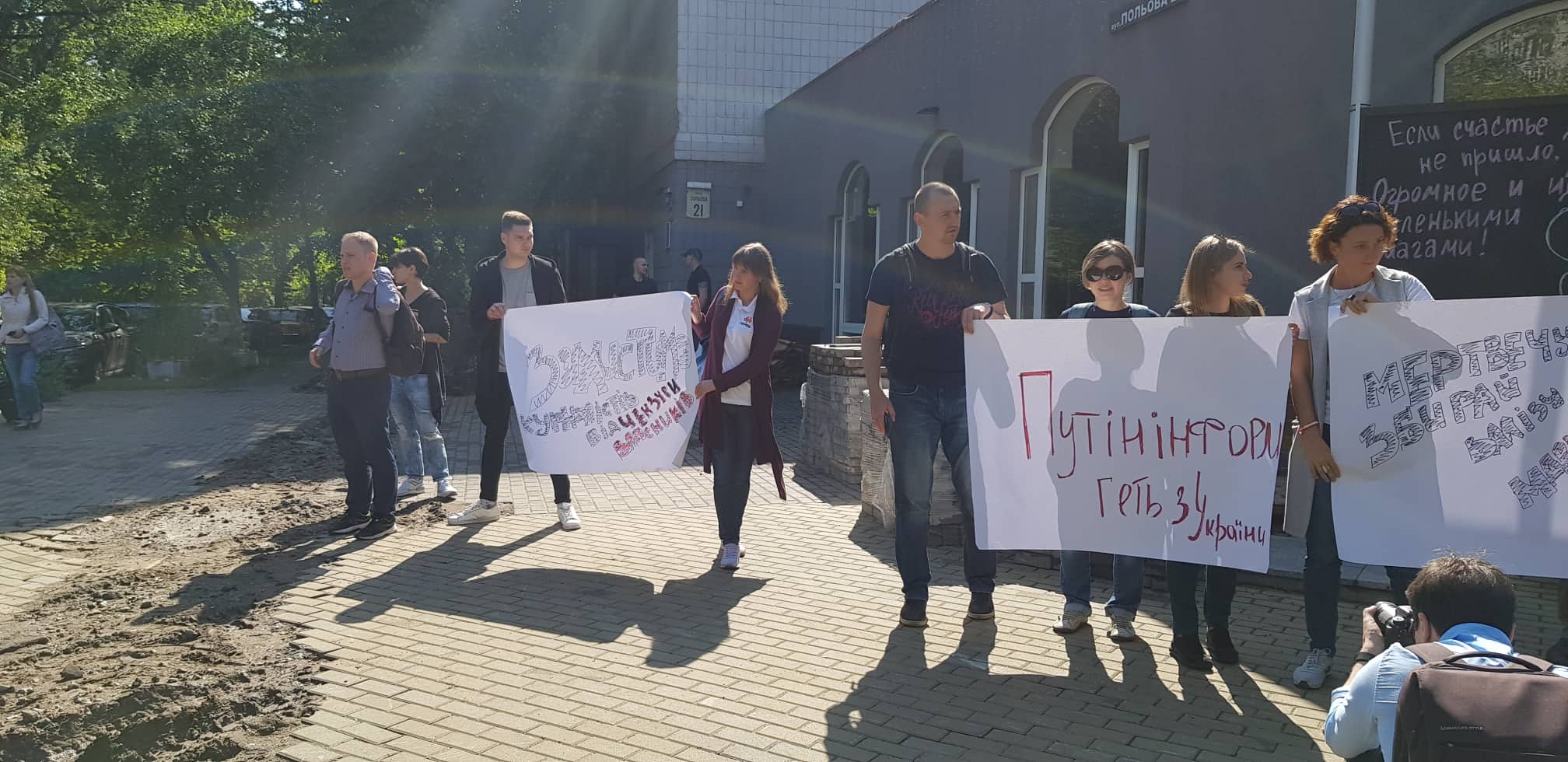 Всего у проходной NewsOne собралось около 30 человек. Они держат в руках плакаты с лозунгами против телемоста. Кричать "Ганьба" и "Путин - геть с Украины". На противоположной улице виднеется баннер с изображением лица лидера политической партии "Голос" Святослава Вакарчука.