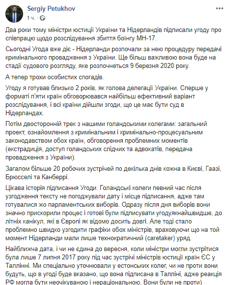 Украина начала процедуру передачи Нидерландам уголовного производства по делу о крушении авиалайнера Boeing-777 рейса МН17, который был сбит в небе над Донбассом в июле 2014 года. Об этом сообщил заместитель министра юстиции Сергей Петухов на своей странице в Facebook.