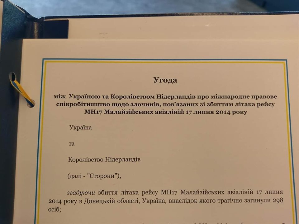 "Два года назад министры юстиции Украины и Нидерландов подписали соглашение о сотрудничестве по расследованию сбивания Boeing-777 рейса МН17. Сегодня соглашение уже действует - Нидерланды начали по нему процедуру передачи уголовного производства из Украины", - говорится в сообщении.