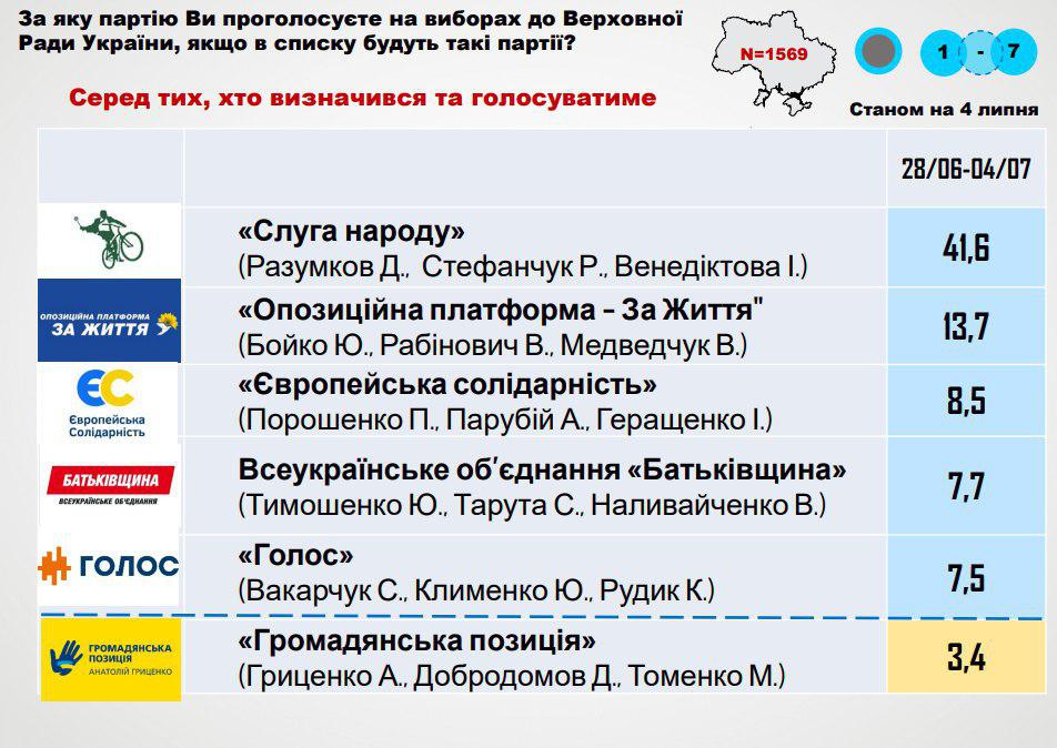Итоги исследования говорят о том, что среди тех избирателей, которые намерены участвовать в голосовании 21 июля и уже определились со своим выбором, 41,6% намерены отдать голос за партию "Слуга народа" Дмитрия Разумкова, 13,7% - за партию "Оппозиционная платформа - За жизнь" Юрия Бойко, Вадима Рабиновича и Виктора Медведчука, 8,5% - "Европейскую солидарность" Петра Порошенко, 7,7% - за ВО "Батькивщина" Юлии Тимошенко, еще 7,5% избирателей готовы проголосовать за партию "Голос" Святослава Вакарчука.