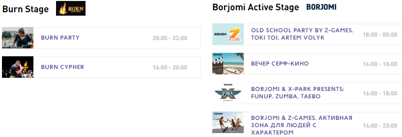 Организаторы опубликовали детальную карту фестивальной территории. Гостей ожидает девять сцен, более 30 зон (бассейн, кемпинг, пресс-зона, детская зона, фудкорт, медпункт и др.), 11 баров.